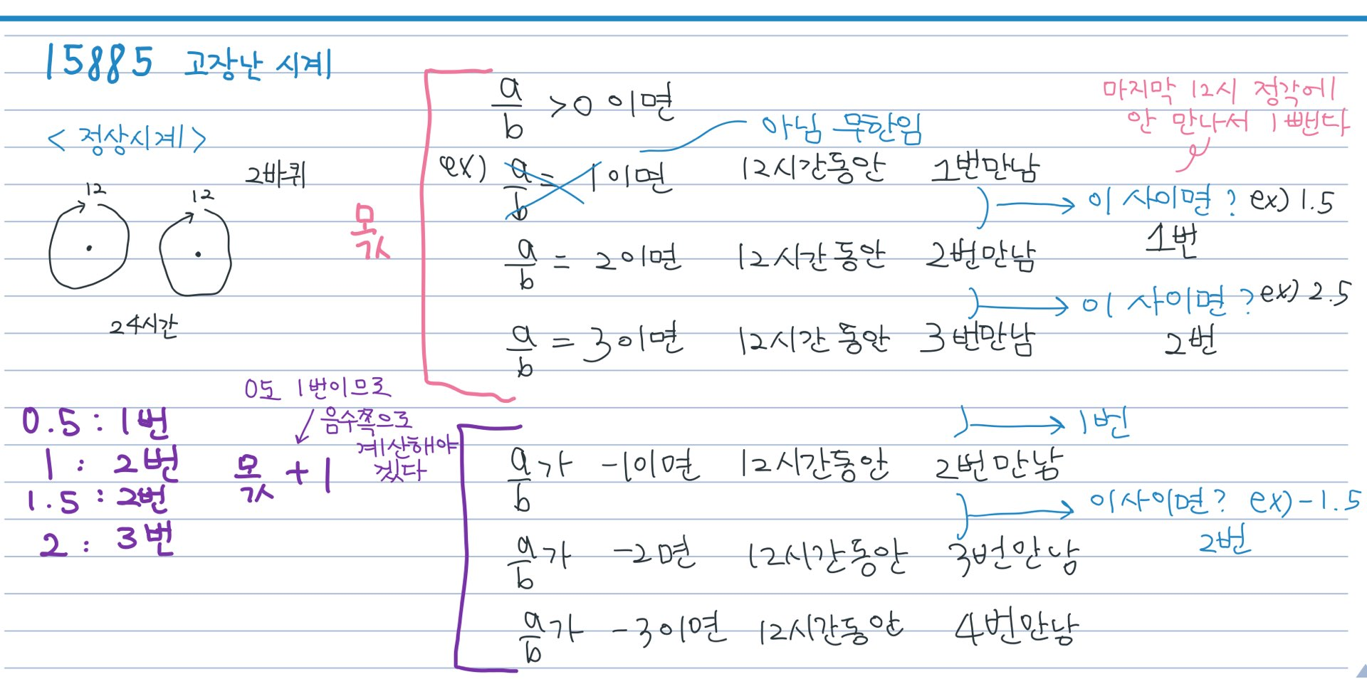 너무 헷갈려서 12시간 기준으로 몇 번 만나는지 계산한 다음 *2를 하면 될 것 같았다. 그래서 위처럼 규칙을 세워서 아래처럼 코딩했음