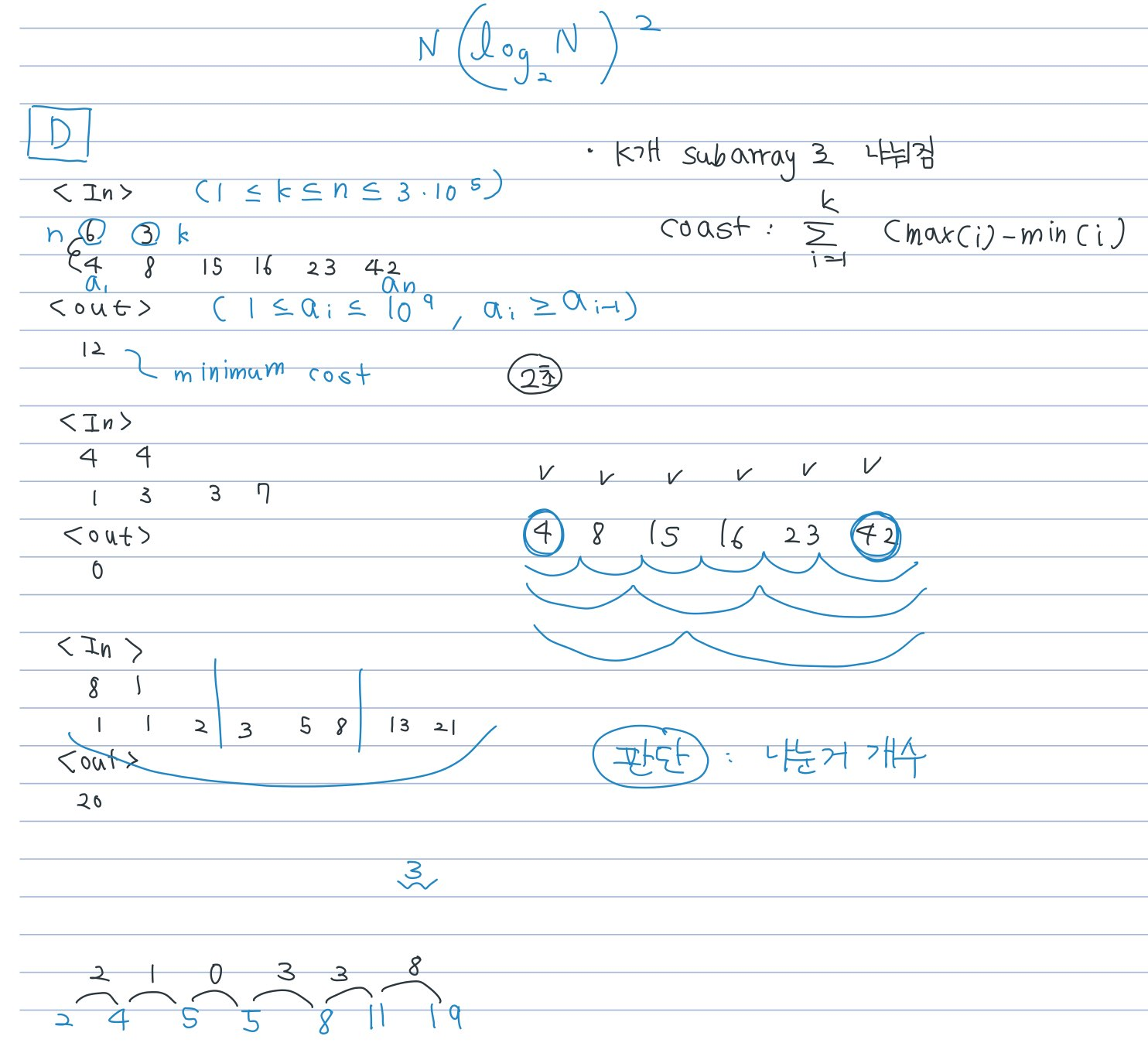 Let max(i)max(i) be equal to the maximum in the ii-th subarray, and min(i)min(i) be equal to the minimum in the ii-th subarray. The cost of division is equal to ∑i=1k(max(i)−min(i))∑i=1k(max(i)−min(i)). For example, if a=[2,4,5,5,8,11,19]a=[2,4,5,5,8,11,19] and we divide it into 33 subarrays in the following way: [2,4],[5,5],[8,11,19][2,4],[5,5],[8,11,19], then the cost of division is equal to (4−2)+(5−5)+(19−8)=13(4−2)+(5−5)+(19−8)=13.