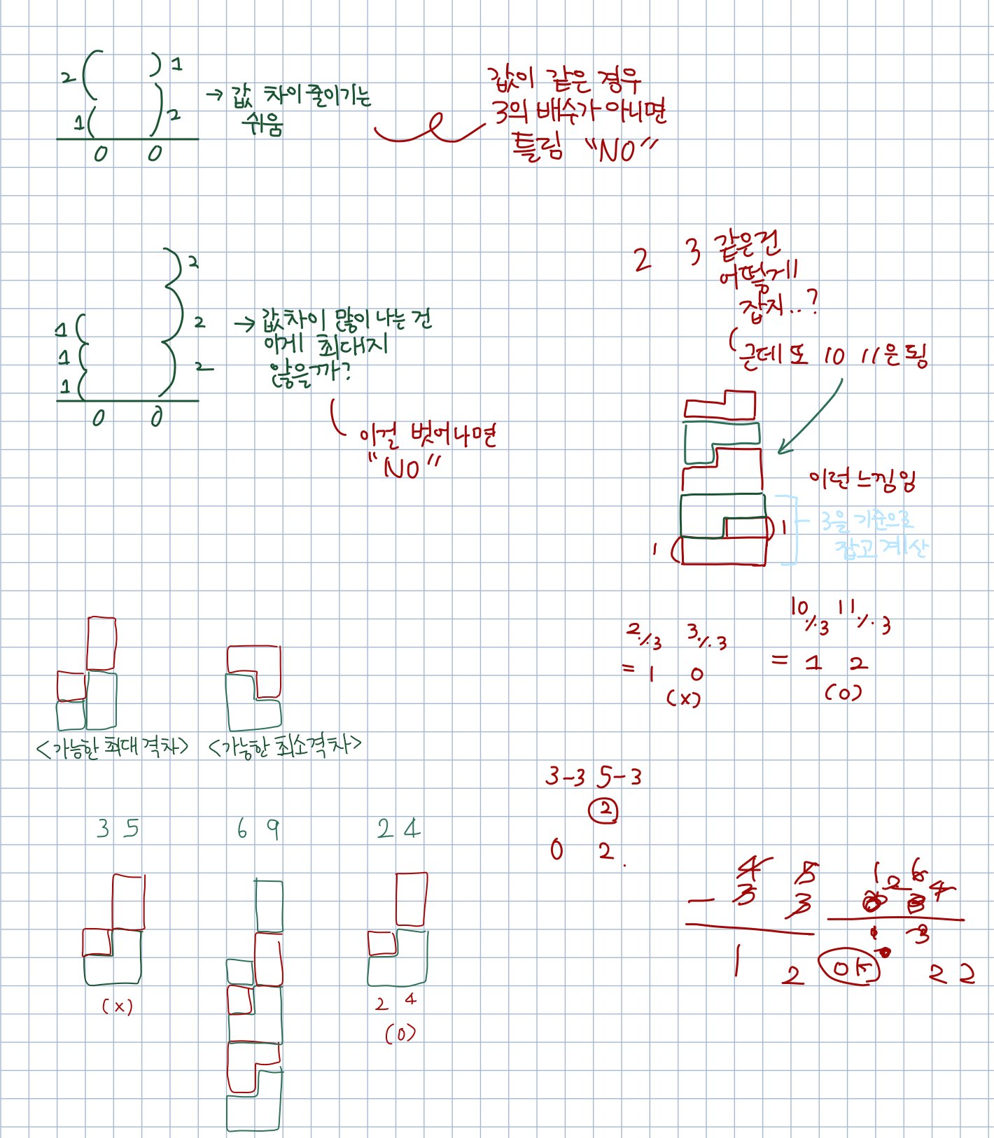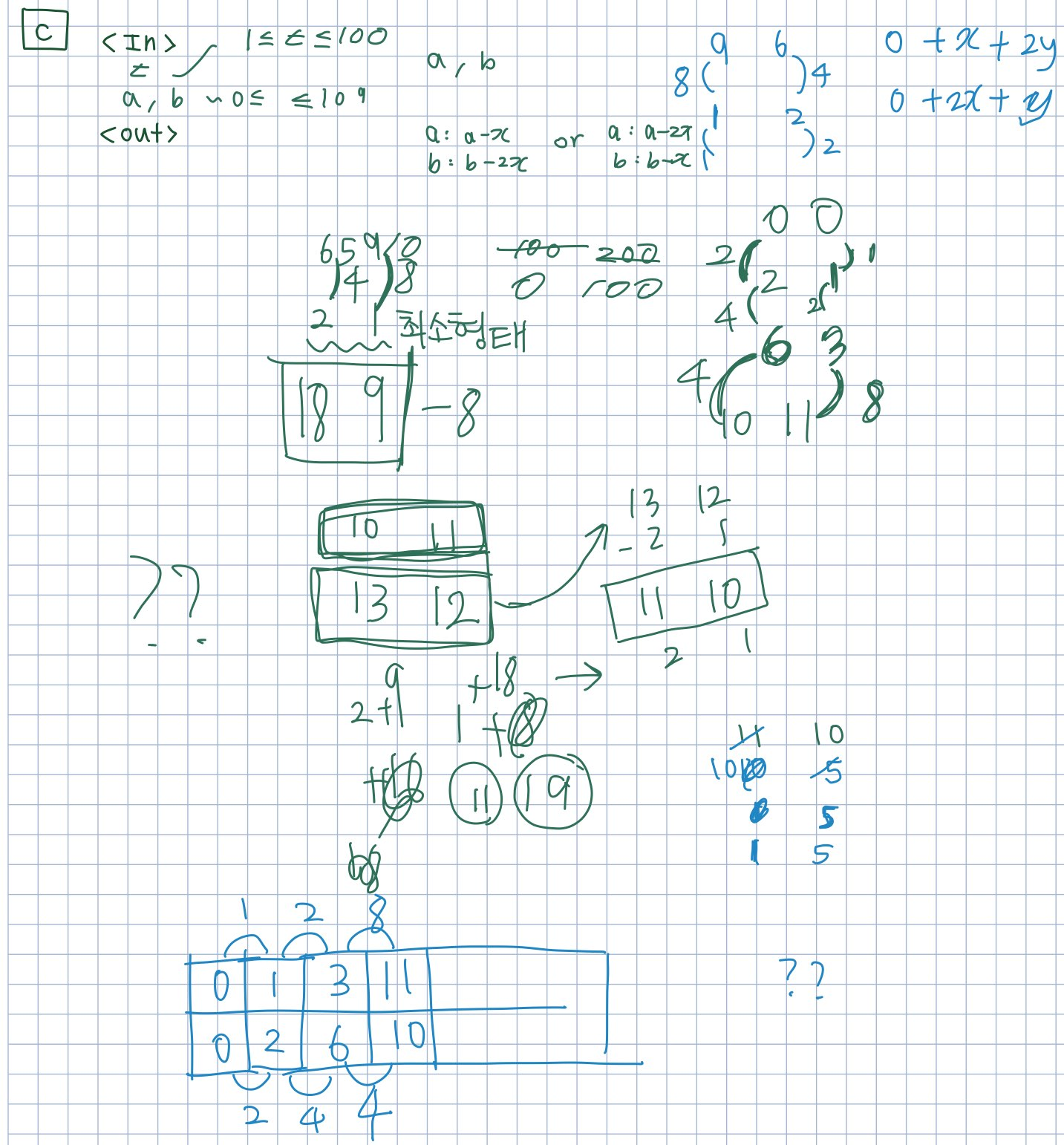 이게 그 유명한 디피인가 생각 들었는데 숫자가 10^9라 과정 찾으려면 시간 엄청 걸리겠다 싶어서 그만뒀음 (사실 어떻게 푸는지도 모른다) 처음에는 값이 하나가 짝수고 하나가 홀수여야 하나? 그런 생각 들었는데 둘 다 홀수인 경우도 있고 또 값이 똑같은데 맞는 경우도 있고 틀린 경우도 있고.. 감도 못 잡고 끝났다ㅋㅋㅋ