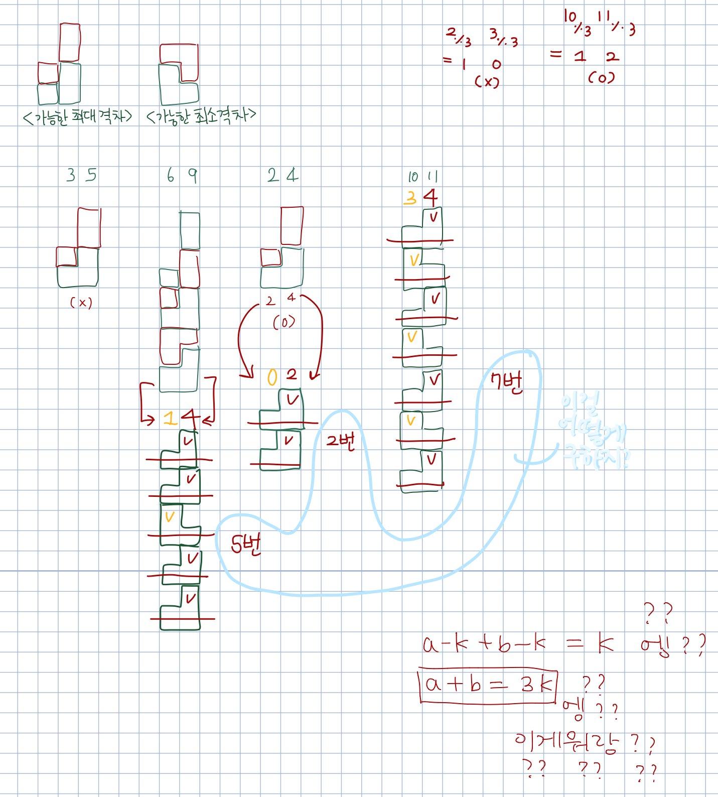 막 또 문제 잡고 있다가 보니깐 규칙이 보였다. 저 (1, 1) 부분이 k개 있으면 나머지가 a-k개랑 b-k개가 남는데 이 두개 더하면 k개랑 같다. 그래서 어.. 어.. / 두개 더한거랑 k랑 같으니 방정식 세우면 결국 a + b = 3k가 됨.. 아니 .. ㅋㅋ