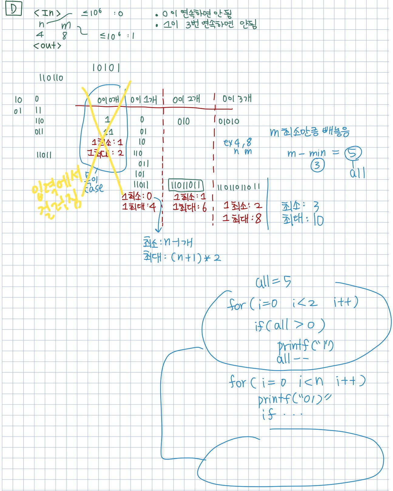 조건이 0은 연속되면 안 되고 1은 세 개 이상 연속되면 안 된다. 예제 출력을 보니 0이 더 조건이 까다로워서 0을 기준으로 1의 개수를 구하면 되겠다 싶었다. 다음으로 가능한 1의 개수 범위를 구해서 범위를 벗어나면 -1을 출력한다. 이제 최소 1의 개수는 있으니 최소 문자열 사이에 남은 1을 끼워주면 끝~~