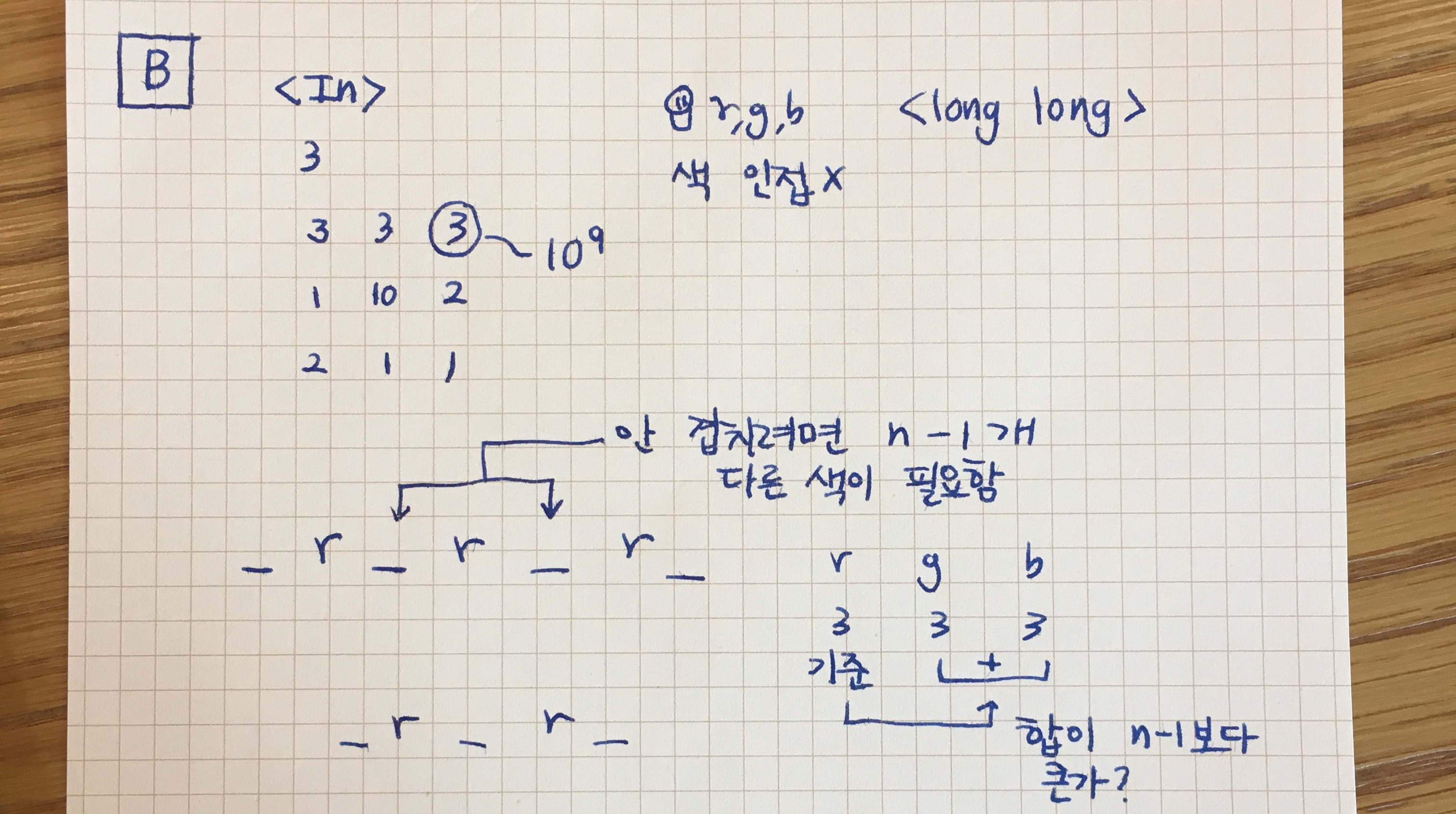 하지만 만약 너가 빨강 1개 초록 10개 파랑 2개를 제공한다면, 가게 직원들은 이것들로 어떠한 garland도 만들 수 없다. 이 전구들로 구성된 어떤 garland도 적어도 한 쌍의 같은 색으로 인접한 전구쌍을 가질 것이다. 가게 직원들이 너가 제공한 전구 모두를 사용해야 한다는 걸 알아둬라.