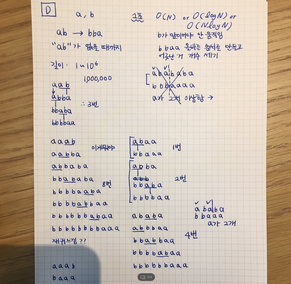 보니깐 b는 다 앞으로 a는 다 뒤로 가야 끝이 나는 건 알겠는데 횟수를 어떻게 세야할지 막막했다. 그래서 막 고민하다가 a와 b의 자리가 뒤바뀌어서 문젠가 싶어서 자리가 바뀐 거 개수 세서 제곱수로 만들어줬음. 왜 제곱수냐면 보니깐 제곱수인 것 같아서.. 아무튼 근거도 없고 틀렸을꺼란 삘이 들었지만 제출했고 틀렸다. 보니깐 1번 답이 3이었다.