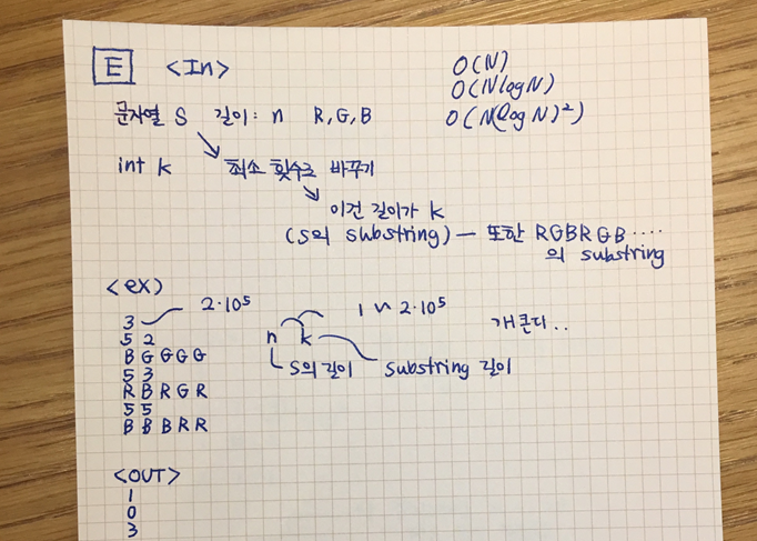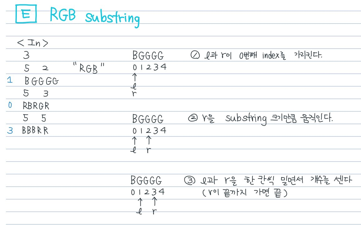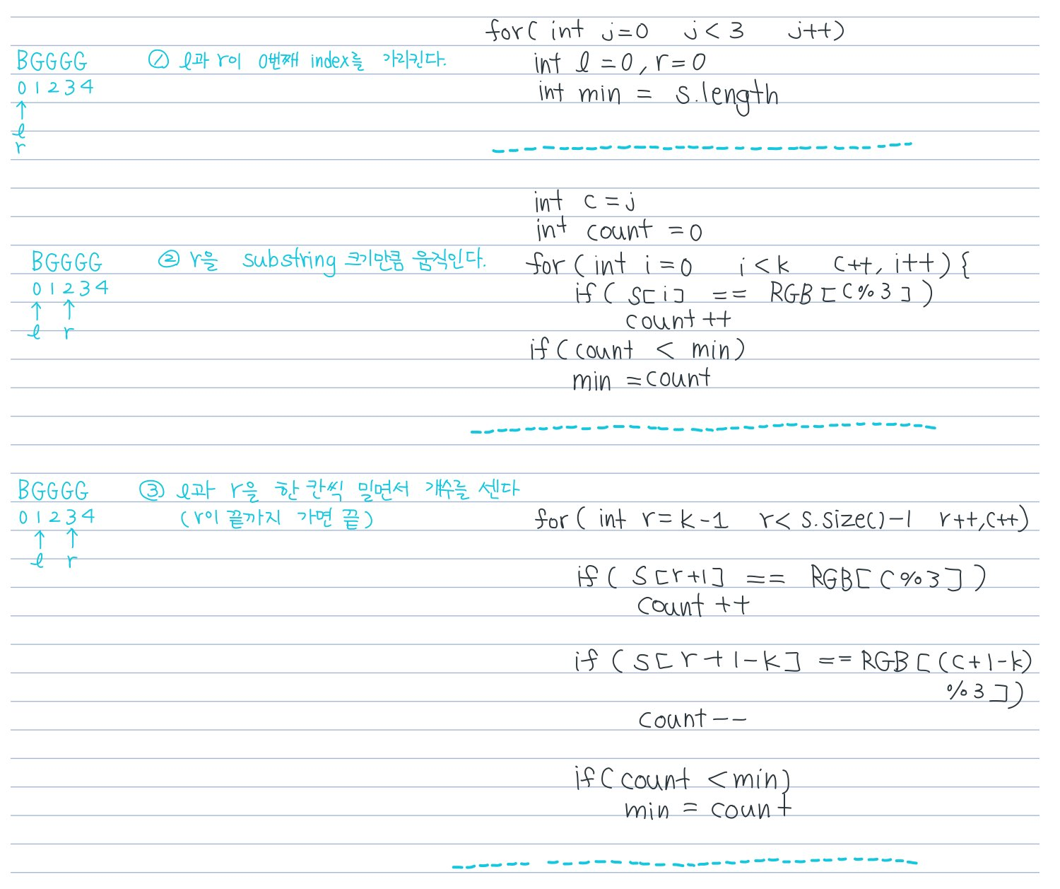 각 질문에 대해 정수를 하나씩 출력해라 -- 처음 문자열 s에서 너가 바꿔야 할 문자의 최소 개수이다. 무한 문자열인 "RGBRGBRGB ..."의 부분 문자열이며 바꾼 이후 길이가 k인 부분 문자열이 있을 것이다. (아 이 문장 너무 길고 어떻게 번역해야할지 모르겠음)