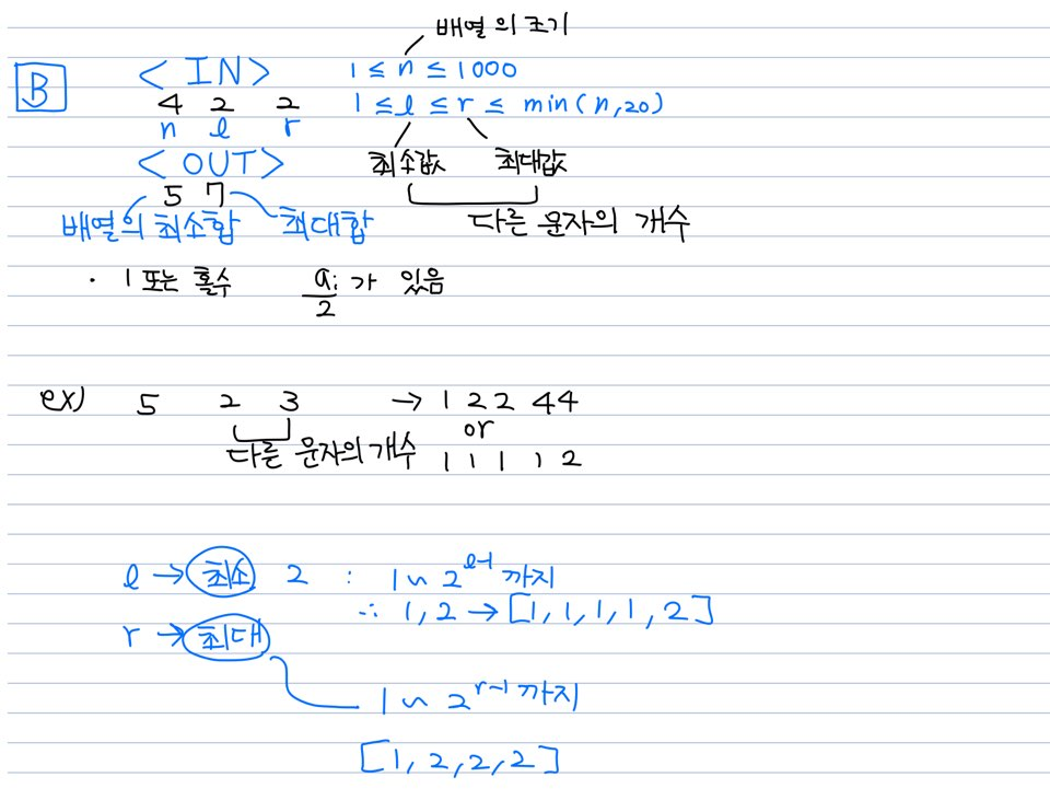 최소는 먼저 2의 제곱수를 채우고 나머지는 1로 채우면 되고, 최대는 반대로 1부터 2의 제곱수까지 채우고 나머지를 가장 큰 제곱수로 채우면 된다. ㅋㅋ 설명이 구린 건 어쩔 수 없다.. 거 머냐 최소 조건만 만족시키고 나머지는 최솟값이나 최댓값 꽉꽉 채우셈..
