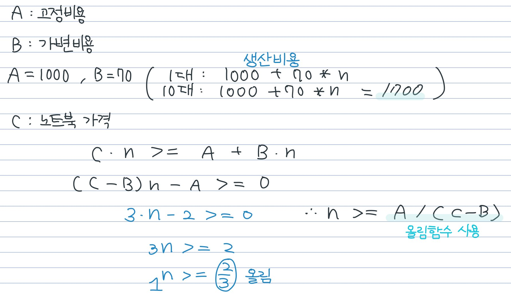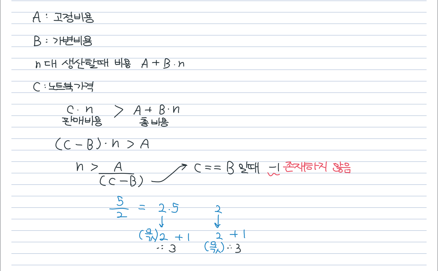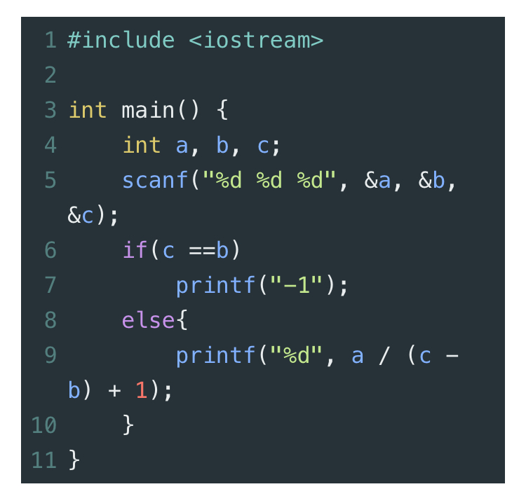 몰랐는데 c < b인 경우도 손익 분기점이 없다!! c가 가격이고 b가 비용인데 비용이 더 비싸면 안되기도 하고, 게다가 계산 결과가 음수가 된다! 이런 것도 고려해야한다니 신기하다. 알고리즘 문제가 아니라 그냥 고등학교 시험에 나오는 문제같다..