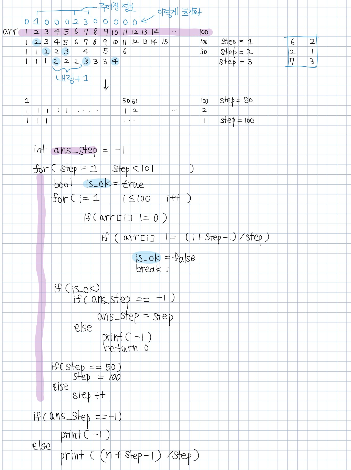 만약 일치하는게 있는데 이미 위치가 저장되었다면 그건 모호하게 되므로 -1출력하고 종료..