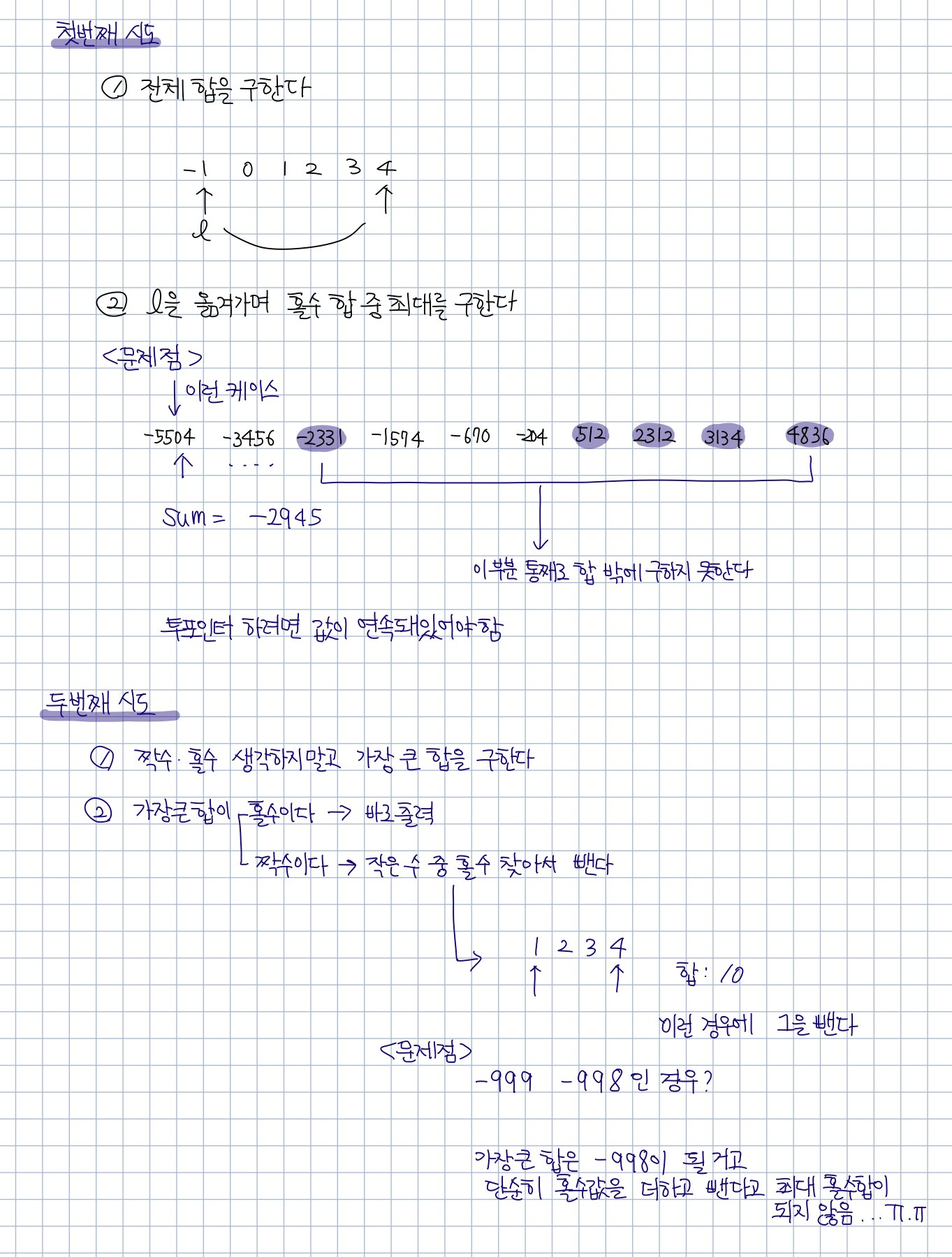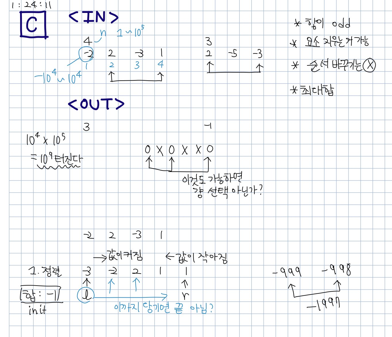 그 다음 생각한 걸로는 최대 합을 구한 후 작은 홀수를 빼면 되겠다 싶었다.