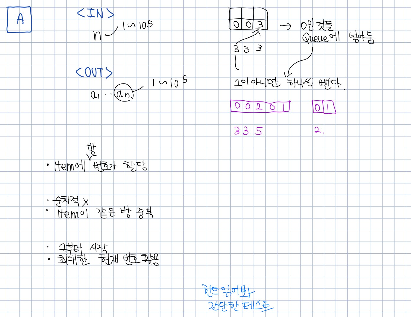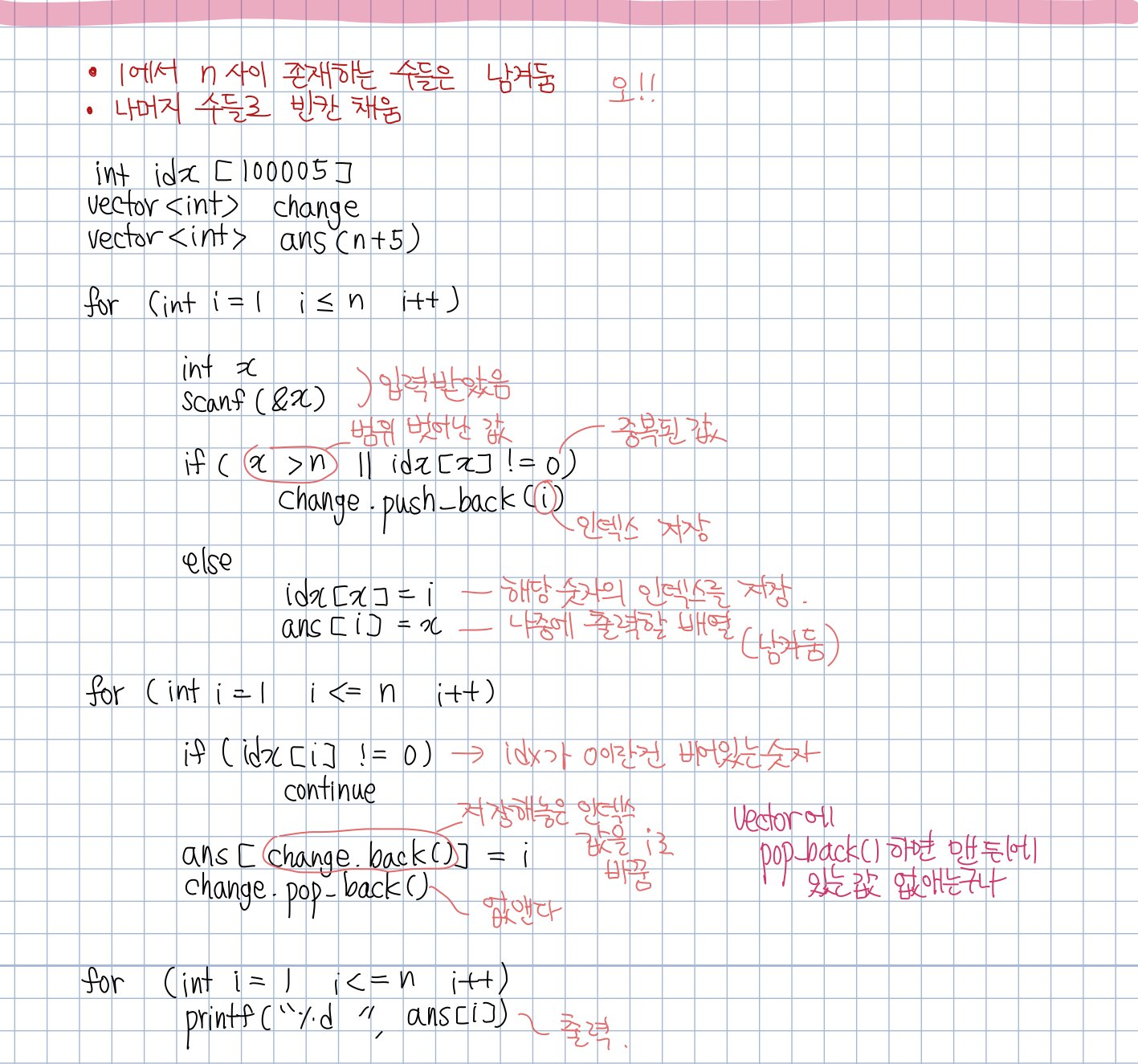 그 다음 count 배열 돌면서 0인걸 따로 저장해놓는다 (이건 없는 값이라 나중에 추가해야 하므로)