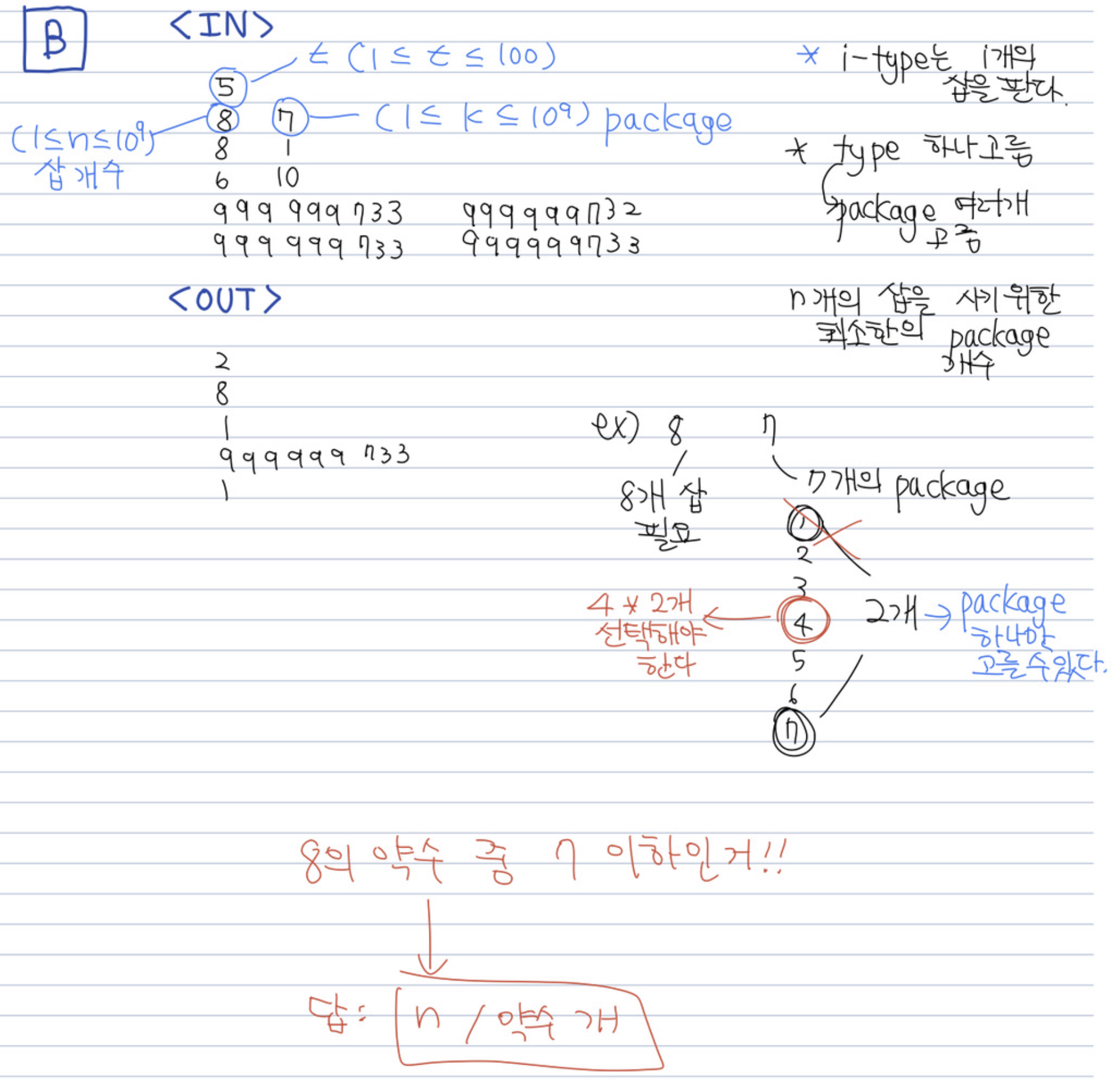 package를 하나만 고를 수 있으므로 n의 약수 package를 선택해야 하고 최소 개수 여야 하므로 약수 중 package값이 가장 큰 걸 선택해야 한다.