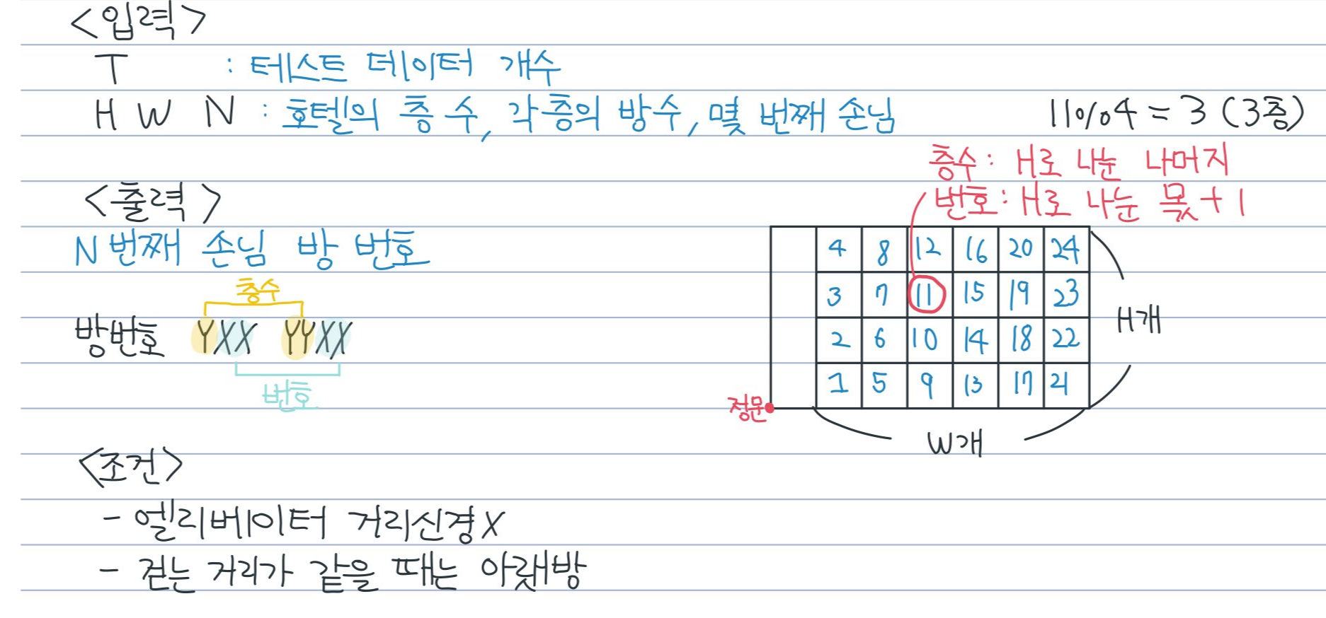 이제 이 코드를 조건문으로 확인 안 하고 한줄로 짜고 싶었는데 어떻게 할지는 잘 모르겠다. 번호 구하는 건 나눠떨어지면 H, 안 나눠떨어지면 H + 1이라 올림으로 합칠 수 있을 것 같은데 앞의 층 수가 문제다. 그래서 그냥 이대로 뒀다.