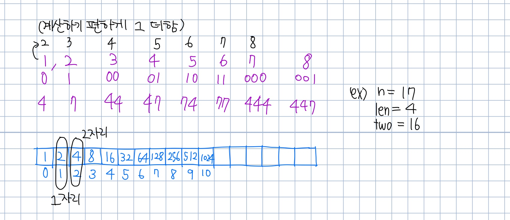 문제는 1도 아니고 01도 아닌 0001 4자리를 맞춰야 하는 건데 이건 따로 2의 거듭제곱을 저장하는 배열을 만들어서 구현했다.