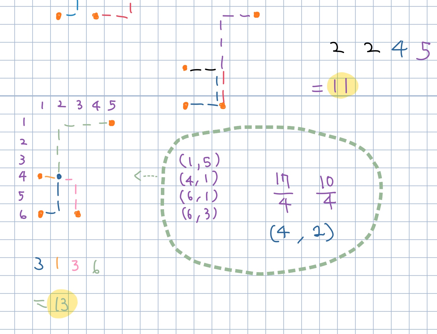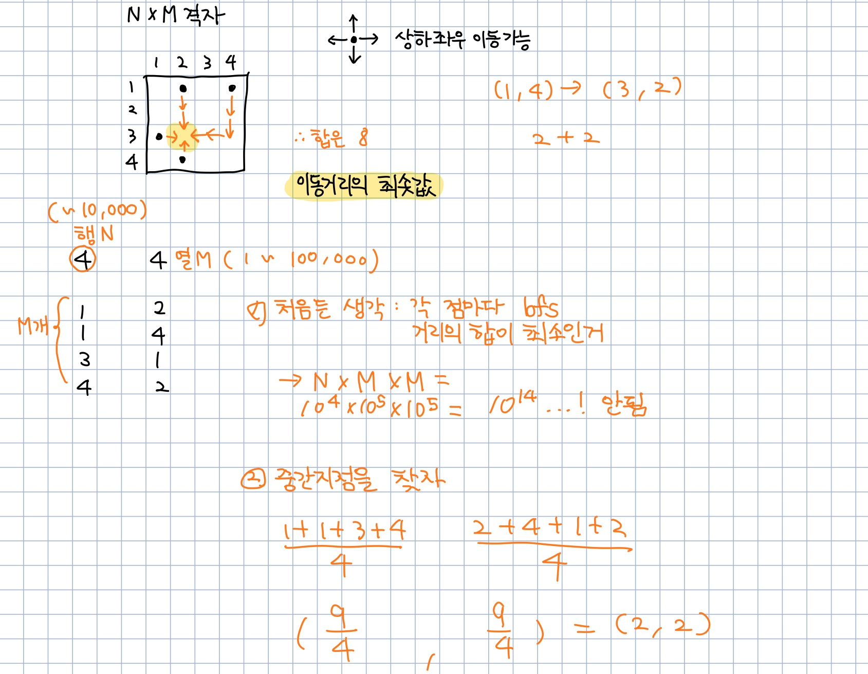 이걸 네 점의 평균 위치에 점을 옮기면 가장 거리가 짧을 것 같았다. 근데 틀림ㅠ