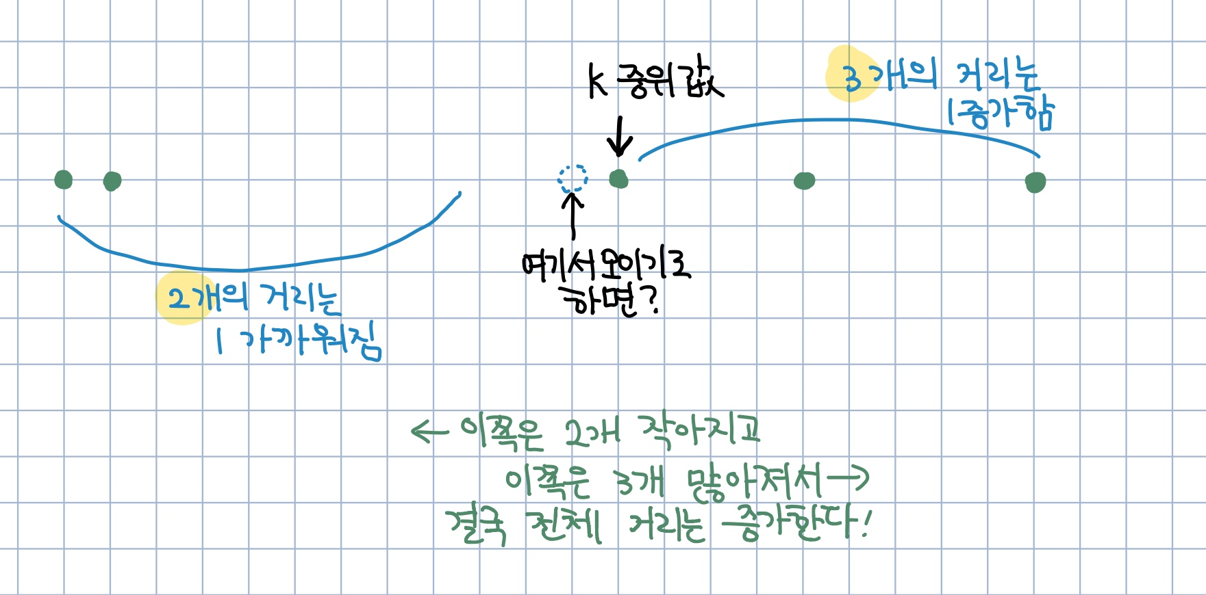 중앙값이라 값을 하나 옮기면 숫자 개수의 차이가 생기니깐 그 차이만큼 거리값이 더해진다