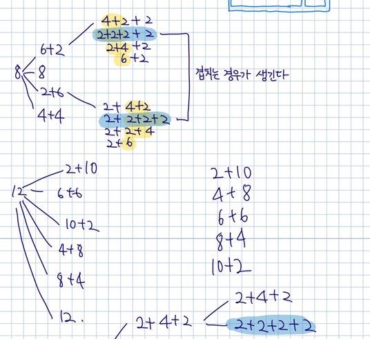 2 + 2 + 2 + 2 전부 2로 이루어진 경우가 자꾸 겹친다...