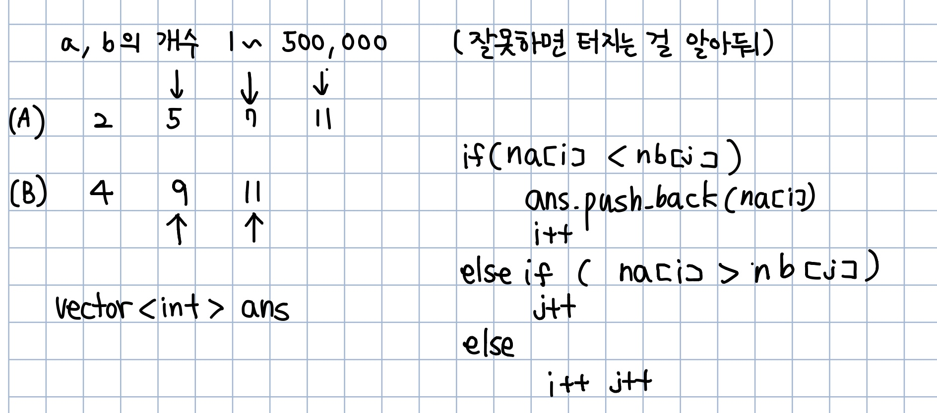 처음에 count 배열 만들어서 a 원소 전부 1로 만들고 b원소 전부 0으로 만든 다음 남아있는 1을 출력하려고 했다.