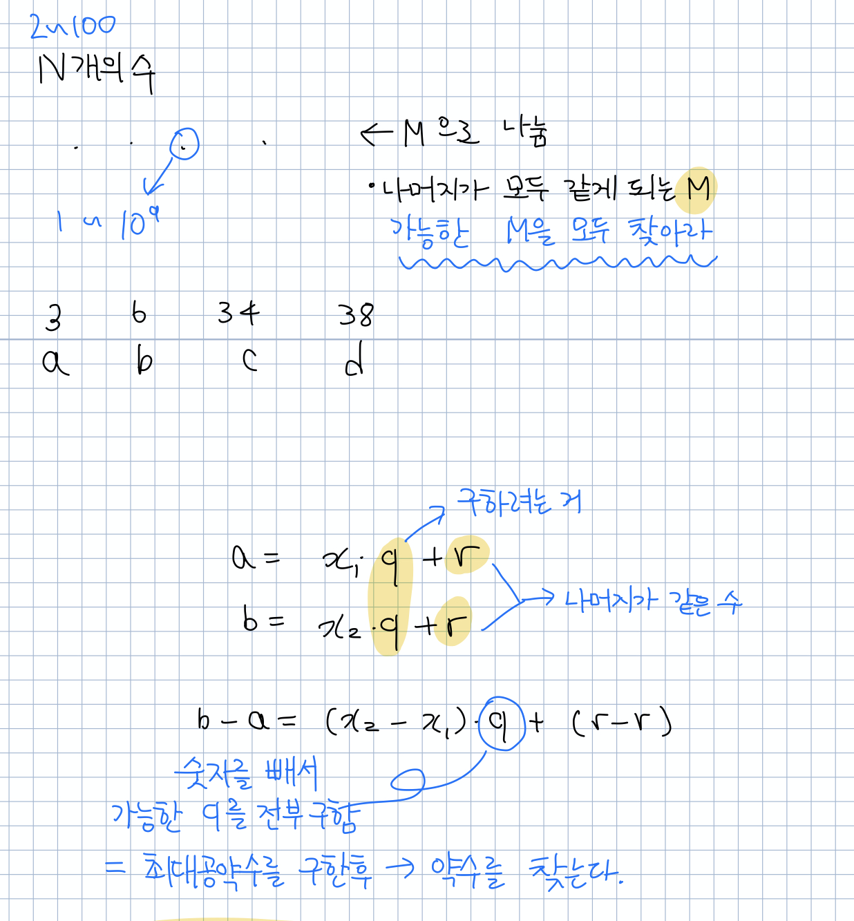 느낌상 모두 M으로 나눠야 하니 M이 모든 수의 약수가 되어야 된다고 생각했는데 나머지가 있는 게 문제였다. 이전에 이런 숫자? 다루는 문제는 숫자끼리 빼야 한다는 걸 풀어봐서 뺐더니 나머지가 같다면 나머지가 없어진다는 것을 알 수 있었다.