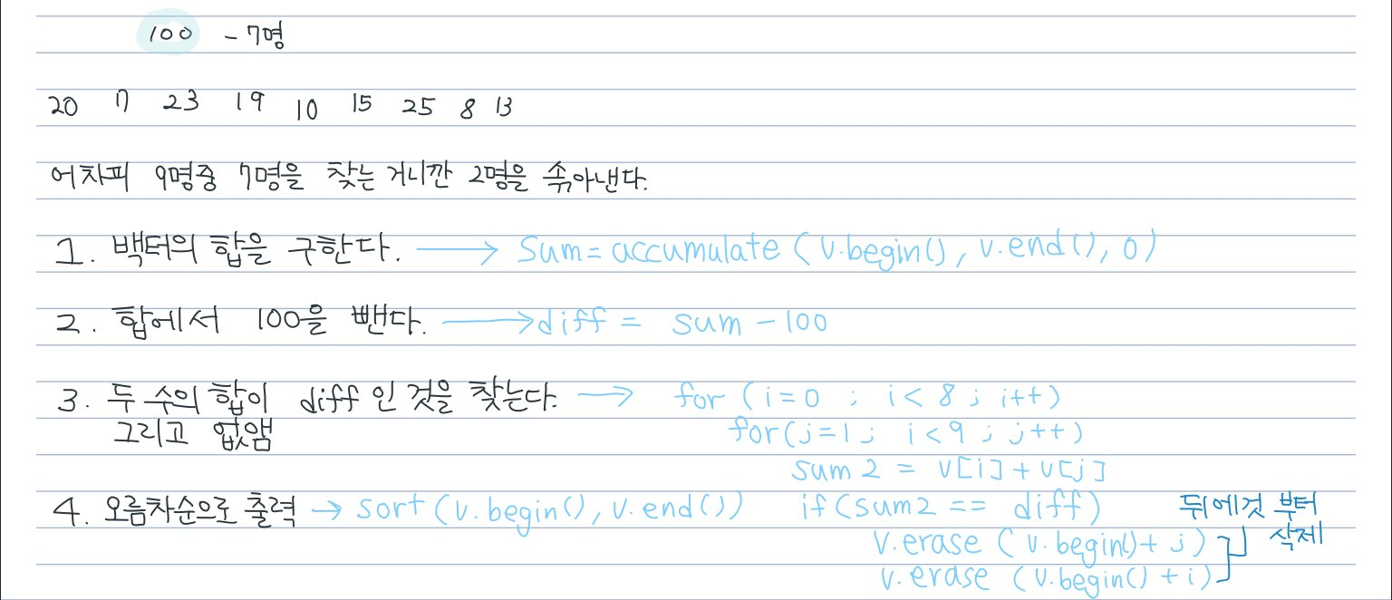 내 생각에는 총 합을 구하고 그 합에서 100을 뺀 값이 다른 키를 가진 사람이라 생각했다. 그래서 두 사람의 키를 더한 값이 차와 같다면 그 두 사람을 제외하면 될 것 같았다.