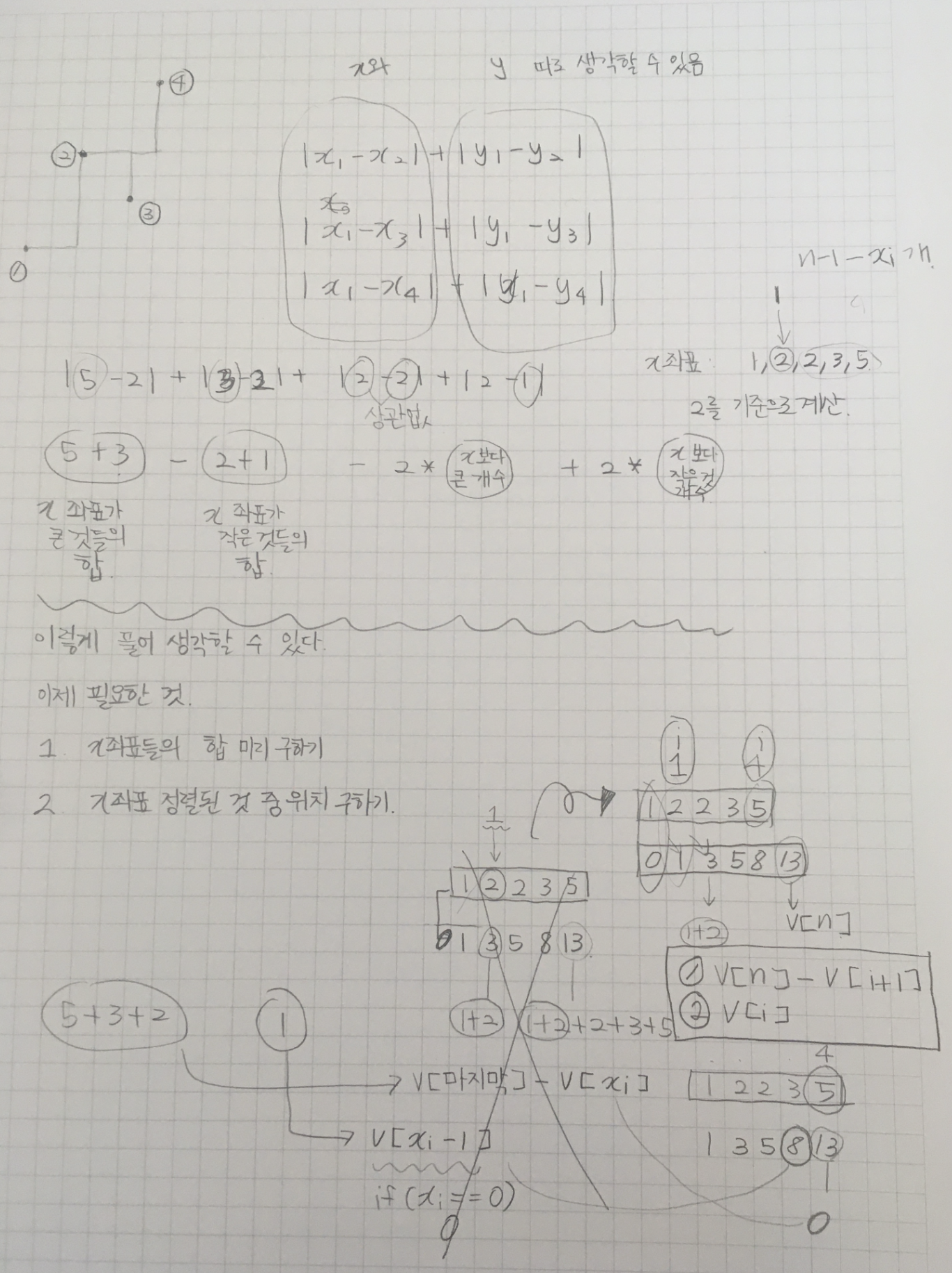 택시거리 x / y 나눠서 생각하고 수식 풀어서 정리한 다음 부분합 + lower_bound 사용해서 풀어야 했다.