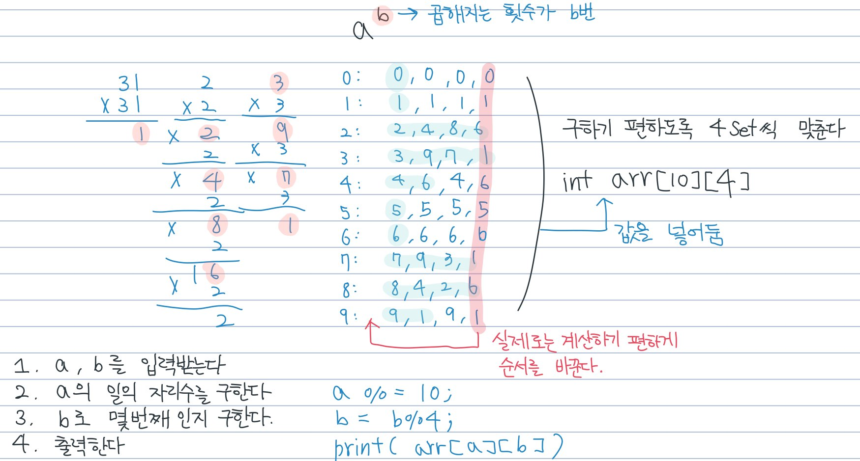문제를 어떻게 풀어야 하는지 감이 왔다. 끝자리가 컴퓨터 번호이다. 하지만 그렇다고 10으로 나눈 나머지로 구할 수 없다.. (100의 1000000 승이나 되는데 어케 구해)