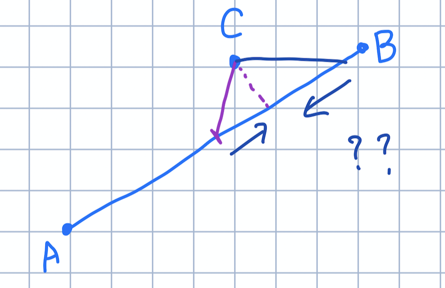 이게 알고보니 선분이 아니라 점과의 거리에 대해서 생각해보면 C에서 거리가 최소고 A, B 방향으로 점이 움직이면서 거리가 멀어지면서 볼록한 함수 형태가 나온다!!! 신기해.