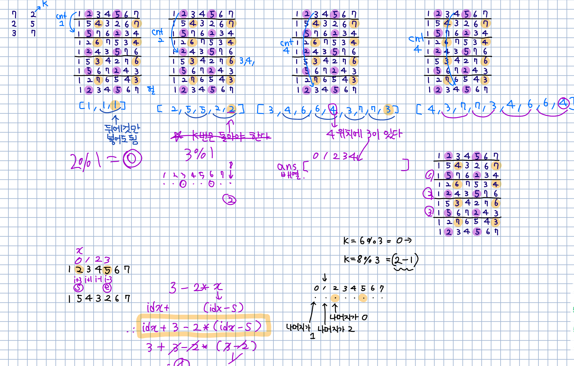 풀려고 했었는데 못 풀었다. 생각난 개념은 중간에 반복되는 걸 센 다음 % 해서 구해야겠다 싶었다. 그런데 나머지 연산으로 결과 계산하는게 제대로 안 됐고 결국에는 포기했다. 계속 뭐가 문제인지 모르니깐 문제를 쳐다보기도 싫었다. 어쩌겠어. 다른 사람 풀이를 참고해서 풀었다.