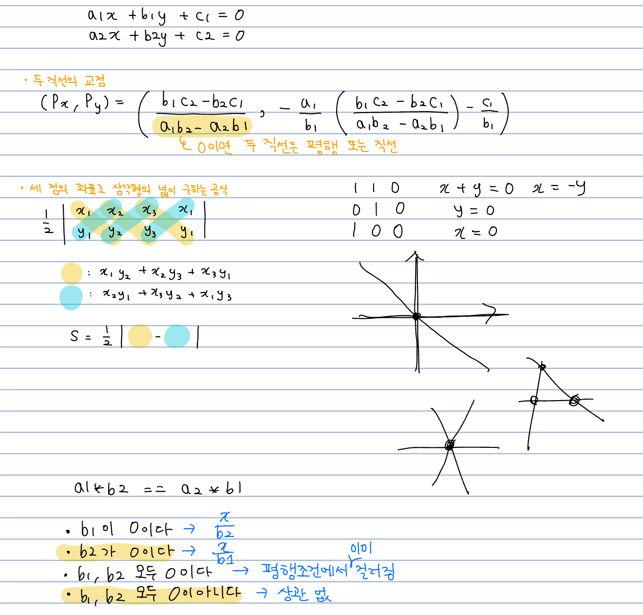 잘 짠 것 같은데 틀렸었다... 알고보니 교점 구하는 공식에 -를 안 곱했었다.