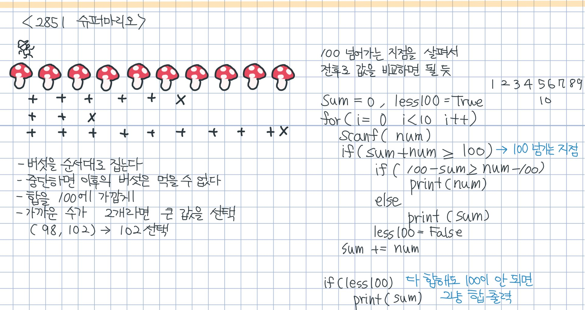 중간에 100을 넘기는 경우는 미리 다음 값을 뭘 받는지 확인해서 더했을 경우 100을 넘는지 확인한다. 더했을 시 100을 넘긴다면 그때는 두 값 중 어느 값이 더 가까운지 확인한다.