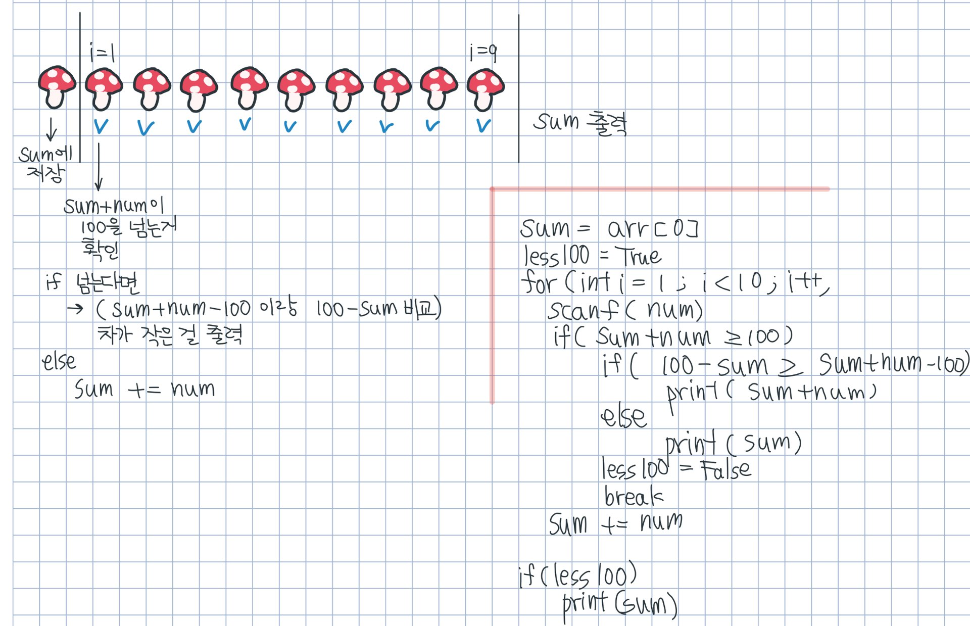 다시 초심으로 돌아가서 한 번 더 어디가 문제인지 살펴봤다. 아! 알고보니 조건을 하나 이상하게 설정했다. sum + num - 100을 해야 하는데 위를 보면 그냥 num - 100으로 비교했다.