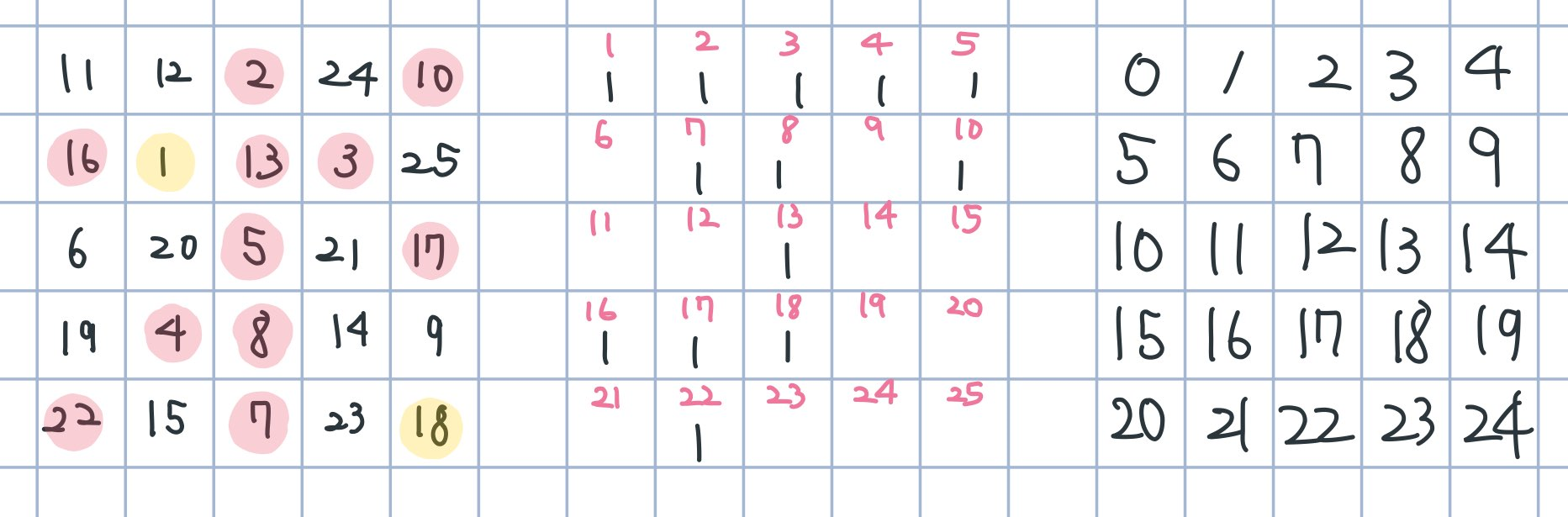 다음으로 빙고가 되기까지 숫자 12개가 필요하므로 11개까지 숫자를 미리 부른 다음에 다음부터 값을 하나씩 넣으면서 빙고인제 체크한다.