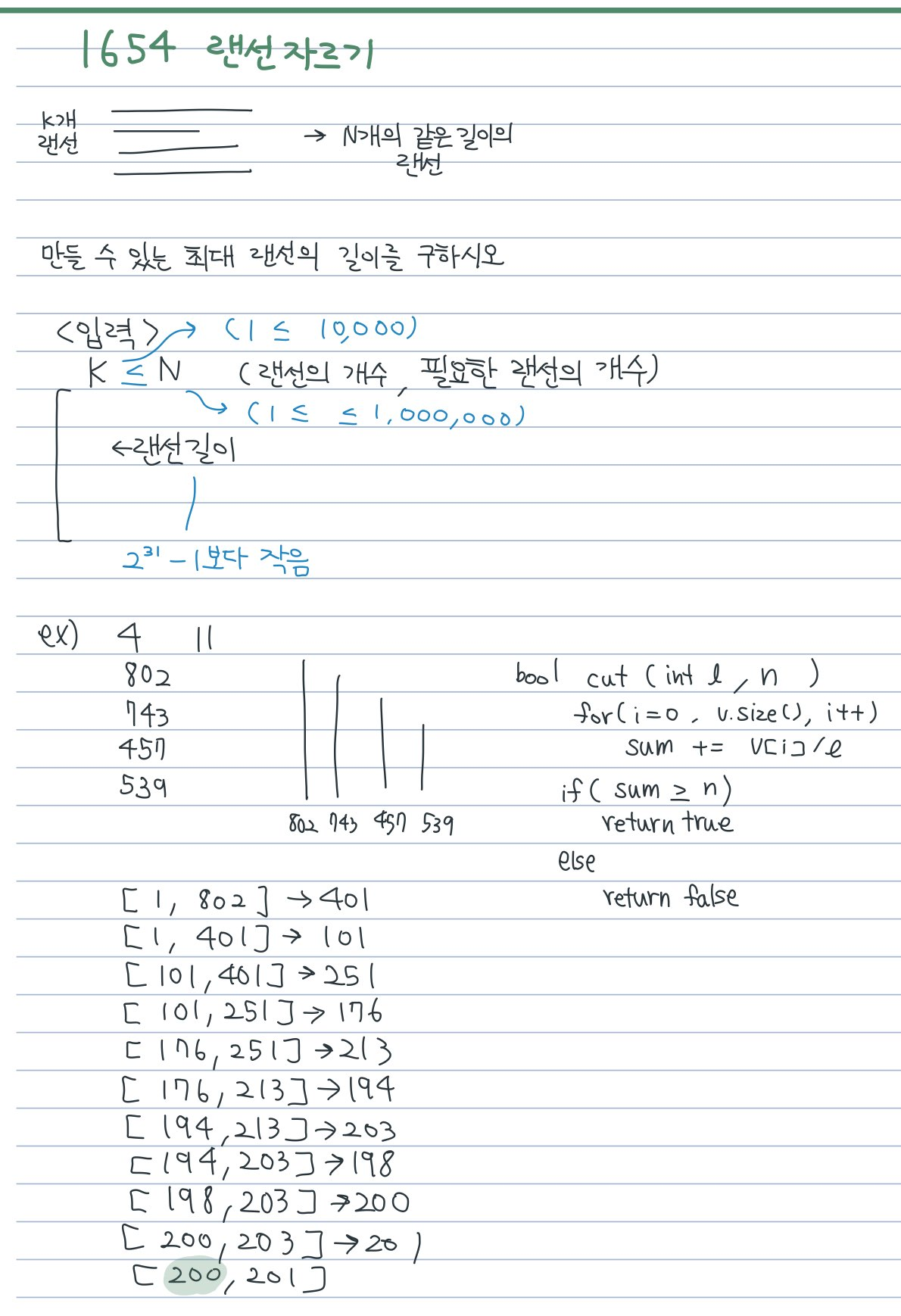 어떻게 풀지 감은 왔다. 랜선의 최댓값을 구하는 거니깐 나무 자르는 문제처럼 범위를 정해서 그 범위 중 최댓값을 구하면 되지 않을까 싶었음. [ ㄱ, ㄴ] 여기서 ㄱ이 만족하는 값 중 최댓값이 된다.